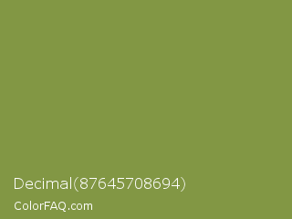 Decimal 87645708694 Color is a normal lime color and the nearest color is Palm Leaf #6f9940. Hex code #829744 and RGB value is rgb(130,151,68). In RGB color space, this color is composed of 51% red, 59% green, 27% blue, In CMYK color space, this color is composed of 14% cyan, 0% magenta, 55% yellow , 41% black , In HSL color space, this color has a hue angle of 75° , 38% saturation and 43% lightness.