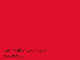 Decimal 342374727 Color is a normal red color and the nearest color is Medium Candy Apple Red #e2062c. Hex code #e00f2b and RGB value is rgb(224,15,43). In RGB color space, this color is composed of 88% red, 6% green, 17% blue, In CMYK color space, this color is composed of 0% cyan, 93% magenta, 81% yellow , 12% black , In HSL color space, this color has a hue angle of 352° , 87% saturation and 47% lightness.
