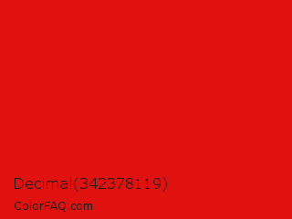 Decimal 342378119 Color is a normal red color and the nearest color is KU Crimson #e8000d. Hex code #e0120f and RGB value is rgb(224,18,15). In RGB color space, this color is composed of 88% red, 7% green, 6% blue, In CMYK color space, this color is composed of 0% cyan, 92% magenta, 93% yellow , 12% black , In HSL color space, this color has a hue angle of 1° , 87% saturation and 47% lightness.
