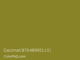 Decimal 87648995110 Color is a normal yellow color and the nearest color is Wasabi #788a25. Hex code #878326 and RGB value is rgb(135,131,38). In RGB color space, this color is composed of 53% red, 51% green, 15% blue, In CMYK color space, this color is composed of 0% cyan, 3% magenta, 72% yellow , 47% black , In HSL color space, this color has a hue angle of 58° , 56% saturation and 34% lightness.