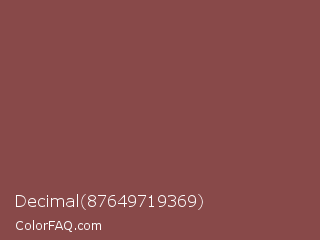 Decimal 87649719369 Color is a normal red color and the nearest color is Cordovan #893f45. Hex code #884949 and RGB value is rgb(136,73,73). In RGB color space, this color is composed of 53% red, 29% green, 29% blue, In CMYK color space, this color is composed of 0% cyan, 46% magenta, 46% yellow , 47% black , In HSL color space, this color has a hue angle of 0° , 30% saturation and 41% lightness.