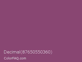 Decimal 87650550360 Color is a normal magenta color and the nearest color is Twilight Lavender #8a496b. Hex code #894672 and RGB value is rgb(137,70,114). In RGB color space, this color is composed of 54% red, 27% green, 45% blue, In CMYK color space, this color is composed of 0% cyan, 49% magenta, 17% yellow , 46% black , In HSL color space, this color has a hue angle of 321° , 32% saturation and 41% lightness.