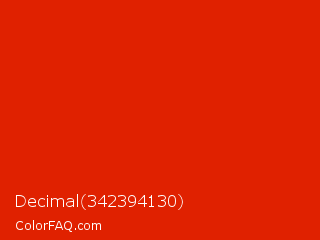 Decimal 342394130 Color is a normal red color and the nearest color is Scarlet #ff2400. Hex code #e02100 and RGB value is rgb(224,33,0). In RGB color space, this color is composed of 88% red, 13% green, 0% blue, In CMYK color space, this color is composed of 0% cyan, 85% magenta, 100% yellow , 12% black , In HSL color space, this color has a hue angle of 9° , 100% saturation and 44% lightness.