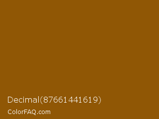 Decimal 87661441619 Color is a dark orange color and the nearest color is Rusty Nail #86560a. Hex code #905705 and RGB value is rgb(144,87,5). In RGB color space, this color is composed of 56% red, 34% green, 2% blue, In CMYK color space, this color is composed of 0% cyan, 40% magenta, 97% yellow , 44% black , In HSL color space, this color has a hue angle of 35° , 93% saturation and 29% lightness.