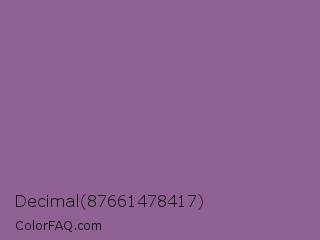 Decimal 87661478417 Color is a normal magenta color and the nearest color is Trendy Pink #8c6495. Hex code #906293 and RGB value is rgb(144,98,147). In RGB color space, this color is composed of 56% red, 38% green, 58% blue, In CMYK color space, this color is composed of 2% cyan, 33% magenta, 0% yellow , 42% black , In HSL color space, this color has a hue angle of 296° , 20% saturation and 48% lightness.