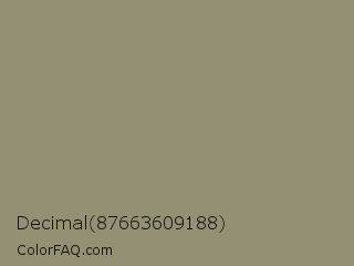 Decimal 87663609188 Color is a normal yellow color and the nearest color is Pale Oyster #988d77. Hex code #939074 and RGB value is rgb(147,144,116). In RGB color space, this color is composed of 58% red, 56% green, 45% blue, In CMYK color space, this color is composed of 0% cyan, 2% magenta, 21% yellow , 42% black , In HSL color space, this color has a hue angle of 54° , 13% saturation and 52% lightness.