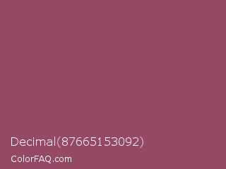 Decimal 87665153092 Color is a normal rose color and the nearest color is Vin Rouge #983d61. Hex code #954964 and RGB value is rgb(149,73,100). In RGB color space, this color is composed of 58% red, 29% green, 39% blue, In CMYK color space, this color is composed of 0% cyan, 51% magenta, 33% yellow , 42% black , In HSL color space, this color has a hue angle of 339° , 34% saturation and 44% lightness.