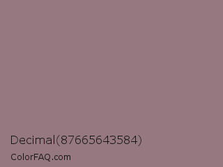 Decimal 87665643584 Color is a normal rose color and the nearest color is Bazaar #98777b. Hex code #967880 and RGB value is rgb(150,120,128). In RGB color space, this color is composed of 59% red, 47% green, 50% blue, In CMYK color space, this color is composed of 0% cyan, 20% magenta, 15% yellow , 41% black , In HSL color space, this color has a hue angle of 344° , 13% saturation and 53% lightness.