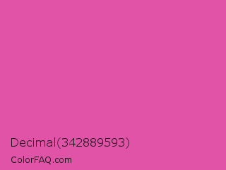 Decimal 342889593 Color is a normal magenta color and the nearest color is Raspberry Pink #e25098. Hex code #e053a7 and RGB value is rgb(224,83,167). In RGB color space, this color is composed of 88% red, 33% green, 65% blue, In CMYK color space, this color is composed of 0% cyan, 63% magenta, 25% yellow , 12% black , In HSL color space, this color has a hue angle of 324° , 69% saturation and 60% lightness.