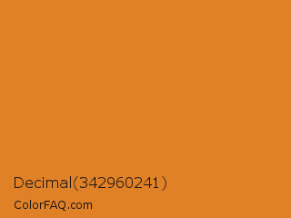 Decimal 342960241 Color is a normal orange color and the nearest color is Zest #e5841b. Hex code #e08027 and RGB value is rgb(224,128,39). In RGB color space, this color is composed of 88% red, 50% green, 15% blue, In CMYK color space, this color is composed of 0% cyan, 43% magenta, 83% yellow , 12% black , In HSL color space, this color has a hue angle of 29° , 75% saturation and 52% lightness.