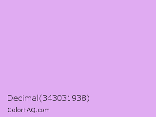 Decimal 343031938 Color is a very light purple color and the nearest color is Mauve #e0b0ff. Hex code #e0abf2 and RGB value is rgb(224,171,242). In RGB color space, this color is composed of 88% red, 67% green, 95% blue, In CMYK color space, this color is composed of 7% cyan, 29% magenta, 0% yellow , 5% black , In HSL color space, this color has a hue angle of 285° , 73% saturation and 81% lightness.