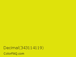 Decimal 343114119 Color is a normal yellow color and the nearest color is Piss Yellow #e1e115. Hex code #e0e30b and RGB value is rgb(224,227,11). In RGB color space, this color is composed of 88% red, 89% green, 4% blue, In CMYK color space, this color is composed of 1% cyan, 0% magenta, 95% yellow , 11% black , In HSL color space, this color has a hue angle of 61° , 91% saturation and 47% lightness.