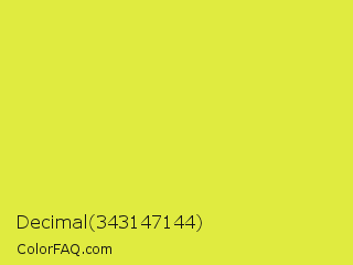 Decimal 343147144 Color is a normal yellow color and the nearest color is Starship #ecf245. Hex code #e0eb40 and RGB value is rgb(224,235,64). In RGB color space, this color is composed of 88% red, 92% green, 25% blue, In CMYK color space, this color is composed of 5% cyan, 0% magenta, 73% yellow , 8% black , In HSL color space, this color has a hue angle of 64° , 81% saturation and 59% lightness.