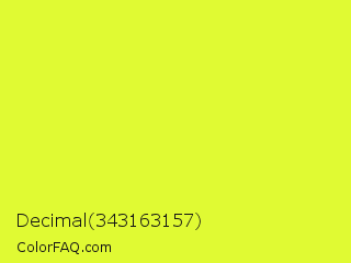 Decimal 343163157 Color is a normal yellow color and the nearest color is Starship #ecf245. Hex code #e0fa33 and RGB value is rgb(224,250,51). In RGB color space, this color is composed of 88% red, 98% green, 20% blue, In CMYK color space, this color is composed of 10% cyan, 0% magenta, 80% yellow , 2% black , In HSL color space, this color has a hue angle of 68° , 95% saturation and 59% lightness.