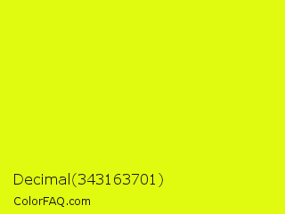 Decimal 343163701 Color is a normal yellow color and the nearest color is Chartreuse Yellow #dfff00. Hex code #e0fb0f and RGB value is rgb(224,251,15). In RGB color space, this color is composed of 88% red, 98% green, 6% blue, In CMYK color space, this color is composed of 11% cyan, 0% magenta, 94% yellow , 2% black , In HSL color space, this color has a hue angle of 67° , 97% saturation and 52% lightness.