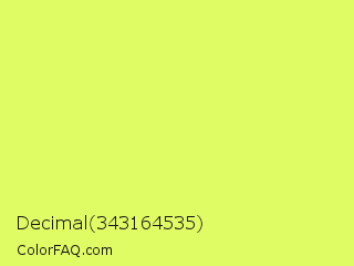 Decimal 343164535 Color is a light lime color and the nearest color is Canary #f3fb62. Hex code #e0fc65 and RGB value is rgb(224,252,101). In RGB color space, this color is composed of 88% red, 99% green, 40% blue, In CMYK color space, this color is composed of 11% cyan, 0% magenta, 60% yellow , 1% black , In HSL color space, this color has a hue angle of 71° , 96% saturation and 69% lightness.