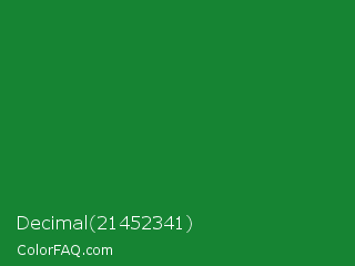 Decimal 21452341 Color is a dark green color and the nearest color is La Salle Green #087830. Hex code #168433 and RGB value is rgb(22,132,51). In RGB color space, this color is composed of 9% red, 52% green, 20% blue, In CMYK color space, this color is composed of 83% cyan, 0% magenta, 61% yellow , 48% black , In HSL color space, this color has a hue angle of 136° , 71% saturation and 30% lightness.