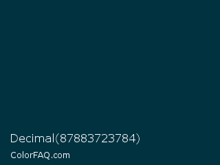 Decimal 87883723784 Color is a very dark cyan color and the nearest color is Tiber #063537. Hex code #013240 and RGB value is rgb(1,50,64). In RGB color space, this color is composed of 0% red, 20% green, 25% blue, In CMYK color space, this color is composed of 98% cyan, 22% magenta, 0% yellow , 75% black , In HSL color space, this color has a hue angle of 193° , 97% saturation and 13% lightness.