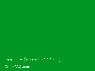 Decimal 87884711190 Color is a dark green color and the nearest color is North Texas Green #059033. Hex code #029624 and RGB value is rgb(2,150,36). In RGB color space, this color is composed of 1% red, 59% green, 14% blue, In CMYK color space, this color is composed of 99% cyan, 0% magenta, 76% yellow , 41% black , In HSL color space, this color has a hue angle of 134° , 97% saturation and 30% lightness.