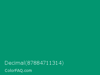 Decimal 87884711314 Color is a dark cyan color and the nearest color is Green NCS #009f6b. Hex code #029670 and RGB value is rgb(2,150,112). In RGB color space, this color is composed of 1% red, 59% green, 44% blue, In CMYK color space, this color is composed of 99% cyan, 0% magenta, 25% yellow , 41% black , In HSL color space, this color has a hue angle of 165° , 97% saturation and 30% lightness.
