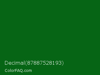 Decimal 87887528193 Color is a very dark green color and the nearest color is Deep Green #056608. Hex code #066515 and RGB value is rgb(6,101,21). In RGB color space, this color is composed of 2% red, 40% green, 8% blue, In CMYK color space, this color is composed of 94% cyan, 0% magenta, 79% yellow , 60% black , In HSL color space, this color has a hue angle of 129° , 89% saturation and 21% lightness.