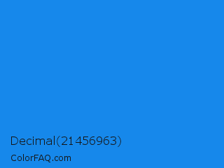 Decimal 21456963 Color is a normal blue color and the nearest color is Dodger Blue #1e90ff. Hex code #1688eb and RGB value is rgb(22,136,235). In RGB color space, this color is composed of 9% red, 53% green, 92% blue, In CMYK color space, this color is composed of 91% cyan, 42% magenta, 0% yellow , 8% black , In HSL color space, this color has a hue angle of 208° , 84% saturation and 50% lightness.