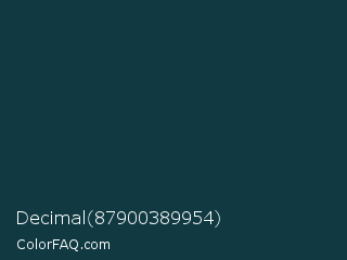 Decimal 87900389954 Color is a very dark cyan color and the nearest color is Elephant #123447. Hex code #103942 and RGB value is rgb(16,57,66). In RGB color space, this color is composed of 6% red, 22% green, 26% blue, In CMYK color space, this color is composed of 76% cyan, 14% magenta, 0% yellow , 74% black , In HSL color space, this color has a hue angle of 191° , 61% saturation and 16% lightness.