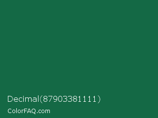 Decimal 87903381111 Color is a dark green color and the nearest color is Jewel #126b40. Hex code #146945 and RGB value is rgb(20,105,69). In RGB color space, this color is composed of 8% red, 41% green, 27% blue, In CMYK color space, this color is composed of 81% cyan, 0% magenta, 34% yellow , 59% black , In HSL color space, this color has a hue angle of 155° , 68% saturation and 25% lightness.