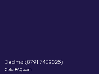 Decimal 87917429025 Color is a very dark indigo color and the nearest color is Port Gore #251f4f. Hex code #201749 and RGB value is rgb(32,23,73). In RGB color space, this color is composed of 13% red, 9% green, 29% blue, In CMYK color space, this color is composed of 56% cyan, 68% magenta, 0% yellow , 71% black , In HSL color space, this color has a hue angle of 251° , 52% saturation and 19% lightness.