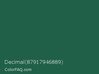 Decimal 87917946889 Color is a dark green color and the nearest color is Green Pea #1d6142. Hex code #206049 and RGB value is rgb(32,96,73). In RGB color space, this color is composed of 13% red, 38% green, 29% blue, In CMYK color space, this color is composed of 67% cyan, 0% magenta, 24% yellow , 62% black , In HSL color space, this color has a hue angle of 158° , 50% saturation and 25% lightness.