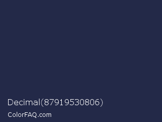 Decimal 87919530806 Color is a very dark blue color and the nearest color is Yankees Blue #1c2841. Hex code #232948 and RGB value is rgb(35,41,72). In RGB color space, this color is composed of 14% red, 16% green, 28% blue, In CMYK color space, this color is composed of 51% cyan, 43% magenta, 0% yellow , 72% black , In HSL color space, this color has a hue angle of 230° , 35% saturation and 21% lightness.