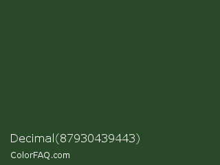 Decimal 87930439443 Color is a very dark green color and the nearest color is Cal Poly Pomona Green #1e4d2b. Hex code #294929 and RGB value is rgb(41,73,41). In RGB color space, this color is composed of 16% red, 29% green, 16% blue, In CMYK color space, this color is composed of 44% cyan, 0% magenta, 44% yellow , 71% black , In HSL color space, this color has a hue angle of 120° , 28% saturation and 22% lightness.