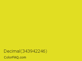 Decimal 343942246 Color is a normal yellow color and the nearest color is Sunflower #e4d422. Hex code #e1de22 and RGB value is rgb(225,222,34). In RGB color space, this color is composed of 88% red, 87% green, 13% blue, In CMYK color space, this color is composed of 0% cyan, 1% magenta, 85% yellow , 12% black , In HSL color space, this color has a hue angle of 59° , 76% saturation and 51% lightness.