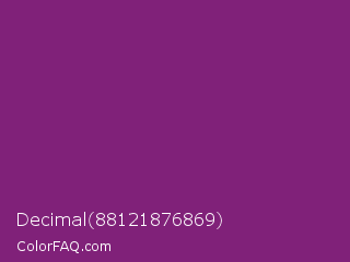 Decimal 88121876869 Color is a normal magenta color and the nearest color is Razzmic Berry Crayola #843179. Hex code #802179 and RGB value is rgb(128,33,121). In RGB color space, this color is composed of 50% red, 13% green, 47% blue, In CMYK color space, this color is composed of 0% cyan, 74% magenta, 5% yellow , 50% black , In HSL color space, this color has a hue angle of 304° , 59% saturation and 32% lightness.