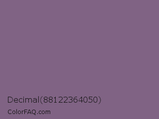 Decimal 88122364050 Color is a normal magenta color and the nearest color is Chinese Violet #856088. Hex code #806384 and RGB value is rgb(128,99,132). In RGB color space, this color is composed of 50% red, 39% green, 52% blue, In CMYK color space, this color is composed of 3% cyan, 25% magenta, 0% yellow , 48% black , In HSL color space, this color has a hue angle of 293° , 14% saturation and 45% lightness.