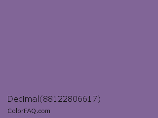 Decimal 88122806617 Color is a normal purple color and the nearest color is Trendy Pink #8c6495. Hex code #816597 and RGB value is rgb(129,101,151). In RGB color space, this color is composed of 51% red, 40% green, 59% blue, In CMYK color space, this color is composed of 15% cyan, 33% magenta, 0% yellow , 41% black , In HSL color space, this color has a hue angle of 274° , 20% saturation and 49% lightness.