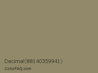 Decimal 88140359941 Color is a normal yellow color and the nearest color is Arrowtown #948771. Hex code #918969 and RGB value is rgb(145,137,105). In RGB color space, this color is composed of 57% red, 54% green, 41% blue, In CMYK color space, this color is composed of 0% cyan, 6% magenta, 28% yellow , 43% black , In HSL color space, this color has a hue angle of 48° , 16% saturation and 49% lightness.