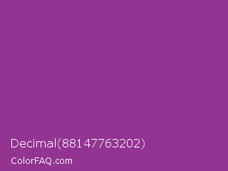 Decimal 88147763202 Color is a normal magenta color and the nearest color is Vivid Violet #803790. Hex code #933392 and RGB value is rgb(147,51,146). In RGB color space, this color is composed of 58% red, 20% green, 57% blue, In CMYK color space, this color is composed of 0% cyan, 65% magenta, 1% yellow , 42% black , In HSL color space, this color has a hue angle of 301° , 48% saturation and 39% lightness.
