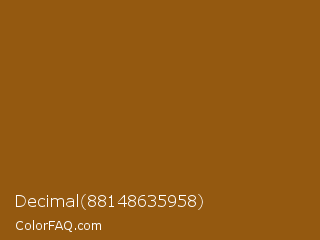 Decimal 88148635958 Color is a normal orange color and the nearest color is Hawaiian Tan #9d5616. Hex code #945910 and RGB value is rgb(148,89,16). In RGB color space, this color is composed of 58% red, 35% green, 6% blue, In CMYK color space, this color is composed of 0% cyan, 40% magenta, 89% yellow , 42% black , In HSL color space, this color has a hue angle of 33° , 80% saturation and 32% lightness.
