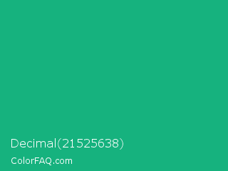 Decimal 21525638 Color is a normal green color and the nearest color is Mountain Meadow Crayola #1ab385. Hex code #16b27e and RGB value is rgb(22,178,126). In RGB color space, this color is composed of 9% red, 70% green, 49% blue, In CMYK color space, this color is composed of 88% cyan, 0% magenta, 29% yellow , 30% black , In HSL color space, this color has a hue angle of 160° , 78% saturation and 39% lightness.
