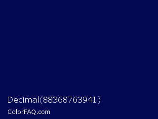 Decimal 88368763941 Color is a very dark blue color and the nearest color is Gulf Blue #051657. Hex code #020851 and RGB value is rgb(2,8,81). In RGB color space, this color is composed of 1% red, 3% green, 32% blue, In CMYK color space, this color is composed of 98% cyan, 90% magenta, 0% yellow , 68% black , In HSL color space, this color has a hue angle of 235° , 95% saturation and 16% lightness.