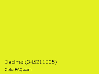 Decimal 345211205 Color is a normal yellow color and the nearest color is Piss Yellow #e1e115. Hex code #e3f021 and RGB value is rgb(227,240,33). In RGB color space, this color is composed of 89% red, 94% green, 13% blue, In CMYK color space, this color is composed of 5% cyan, 0% magenta, 86% yellow , 6% black , In HSL color space, this color has a hue angle of 64° , 87% saturation and 54% lightness.
