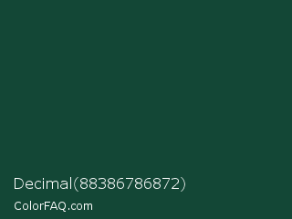 Decimal 88386786872 Color is a very dark green color and the nearest color is MSU Green #18453b. Hex code #134736 and RGB value is rgb(19,71,54). In RGB color space, this color is composed of 7% red, 28% green, 21% blue, In CMYK color space, this color is composed of 73% cyan, 0% magenta, 24% yellow , 72% black , In HSL color space, this color has a hue angle of 160° , 58% saturation and 18% lightness.