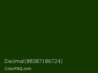 Decimal 88387186724 Color is a very dark green color and the nearest color is Deep Forest Green #182d09. Hex code #143700 and RGB value is rgb(20,55,0). In RGB color space, this color is composed of 8% red, 22% green, 0% blue, In CMYK color space, this color is composed of 64% cyan, 0% magenta, 100% yellow , 78% black , In HSL color space, this color has a hue angle of 98° , 100% saturation and 11% lightness.