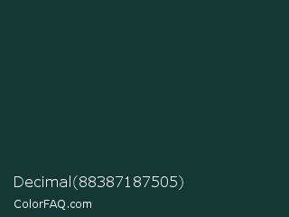 Decimal 88387187505 Color is a very dark cyan color and the nearest color is Gable Green #163531. Hex code #143833 and RGB value is rgb(20,56,51). In RGB color space, this color is composed of 8% red, 22% green, 20% blue, In CMYK color space, this color is composed of 64% cyan, 0% magenta, 9% yellow , 78% black , In HSL color space, this color has a hue angle of 172° , 47% saturation and 15% lightness.