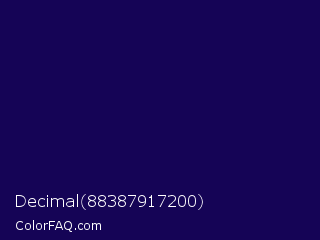 Decimal 88387917200 Color is a very dark indigo color and the nearest color is Tolopea #1b0245. Hex code #150456 and RGB value is rgb(21,4,86). In RGB color space, this color is composed of 8% red, 2% green, 34% blue, In CMYK color space, this color is composed of 76% cyan, 95% magenta, 0% yellow , 66% black , In HSL color space, this color has a hue angle of 252° , 91% saturation and 18% lightness.