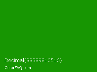 Decimal 88389810516 Color is a dark green color and the nearest color is India Green #138808. Hex code #179602 and RGB value is rgb(23,150,2). In RGB color space, this color is composed of 9% red, 59% green, 1% blue, In CMYK color space, this color is composed of 85% cyan, 0% magenta, 99% yellow , 41% black , In HSL color space, this color has a hue angle of 111° , 97% saturation and 30% lightness.