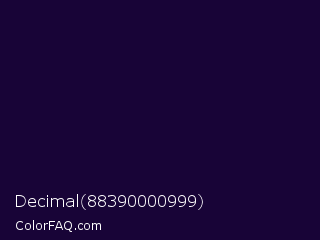 Decimal 88390000999 Color is a very dark violet color and the nearest color is Black Rock #0d0332. Hex code #180437 and RGB value is rgb(24,4,55). In RGB color space, this color is composed of 9% red, 2% green, 22% blue, In CMYK color space, this color is composed of 56% cyan, 93% magenta, 0% yellow , 78% black , In HSL color space, this color has a hue angle of 264° , 86% saturation and 12% lightness.