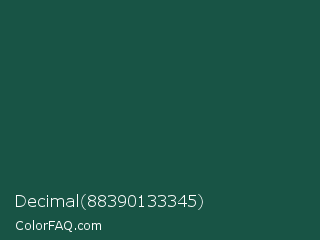 Decimal 88390133345 Color is a very dark cyan color and the nearest color is Brunswick Green #1b4d3e. Hex code #185445 and RGB value is rgb(24,84,69). In RGB color space, this color is composed of 9% red, 33% green, 27% blue, In CMYK color space, this color is composed of 71% cyan, 0% magenta, 18% yellow , 67% black , In HSL color space, this color has a hue angle of 165° , 56% saturation and 21% lightness.