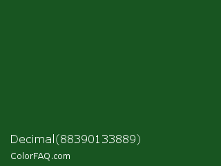Decimal 88390133889 Color is a very dark green color and the nearest color is Parsley #134f19. Hex code #185521 and RGB value is rgb(24,85,33). In RGB color space, this color is composed of 9% red, 33% green, 13% blue, In CMYK color space, this color is composed of 72% cyan, 0% magenta, 61% yellow , 67% black , In HSL color space, this color has a hue angle of 129° , 56% saturation and 21% lightness.